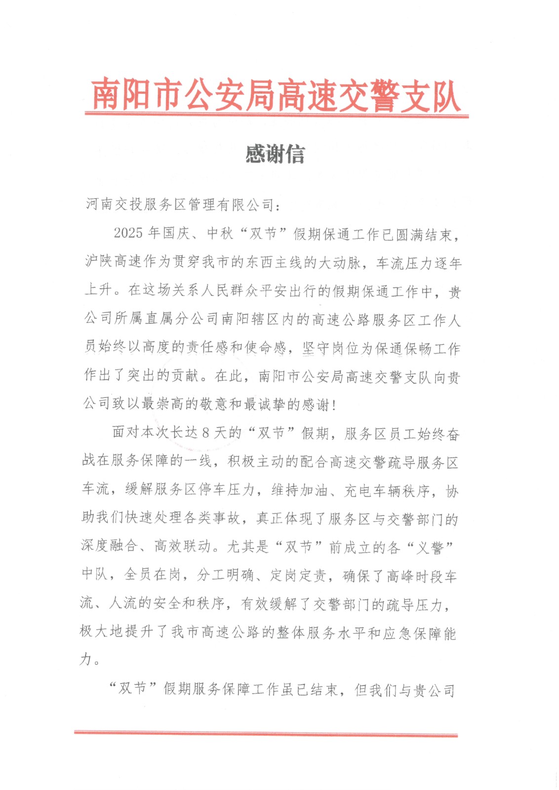 《一封感謝信 濃濃服務(wù)…》 10月10日,南陽(yáng)市公安局高速交警支隊(duì)向公司所屬直屬分公司寄來(lái)感謝信,表達(dá)對(duì)南陽(yáng)轄區(qū)內(nèi)…